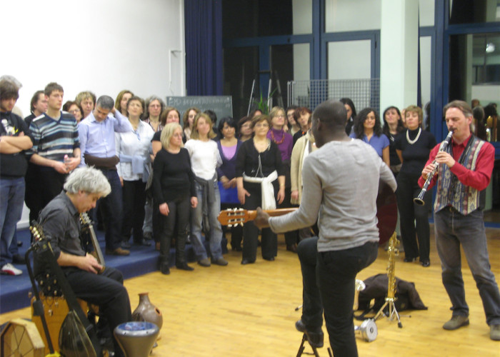 Un seminario per cantanti con ogni tipo di esperienza vocale e senza barriere di età. Un concerto finale con le voci dei SuperCori che si sommano a quelle del gruppo Corale femminile dell’Iris Versari di Cesano Maderno dirette da Raffaele Cifani, alla voce sciamanica di Arsene Duevi, ai clarinetti di Alberto Ferrari, agli strumenti insoliti di Roberto Zanisi e alle percussioni a acqua di Tetè Da Silveira. Una grande miscela generazionale, un mix di energia dal nord e dal sud del mondo. Dalle 14.30 alle 16.30 Seminario riservato per adolescenti; poi porte aperte agli adulti e ai musicisti professionisti per cantare e suonare insieme. Al termine concerto aperto al pubblico.