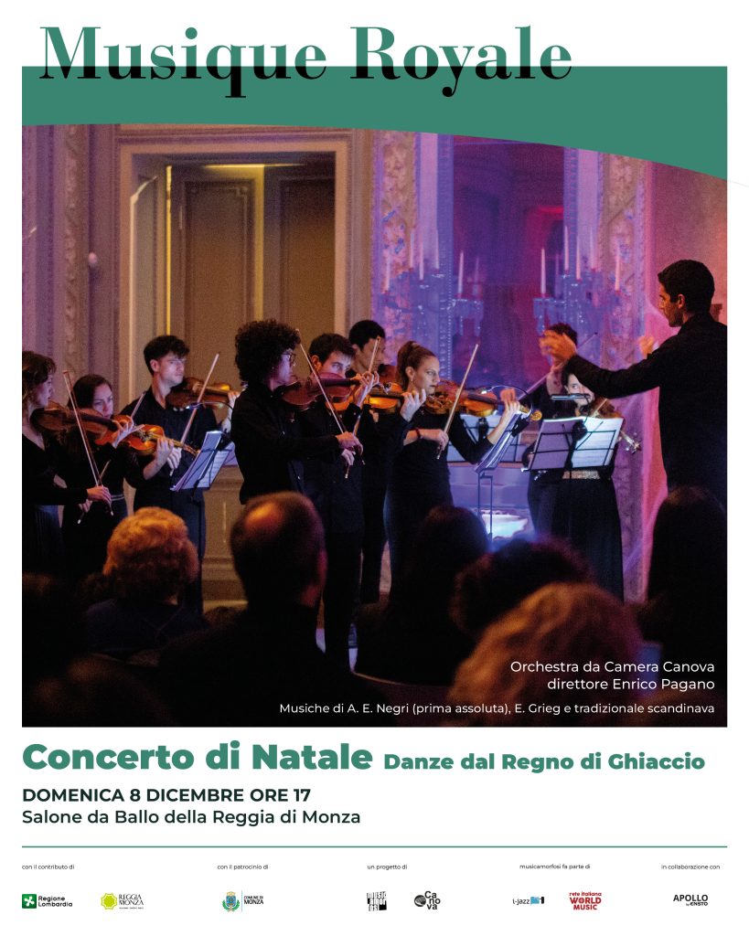 Le pareti della Villa Reale sono formate di neve, soffia un vento glaciale che apre porte e finestre delle oltre settecento stanze, l’aurora boreale illumina i lunghi e vuoti corridoi in cui passeggia pensierosa la Regina delle Nevi… ma dal Salone da Ballo, prima lievi e poi sempre più incalzanti, arrivano le note del Concerto di Natale dell’Orchestra da Camera Canova.